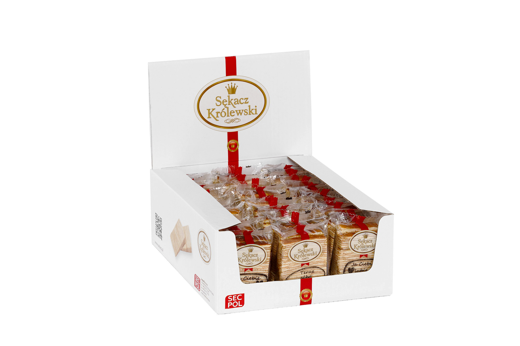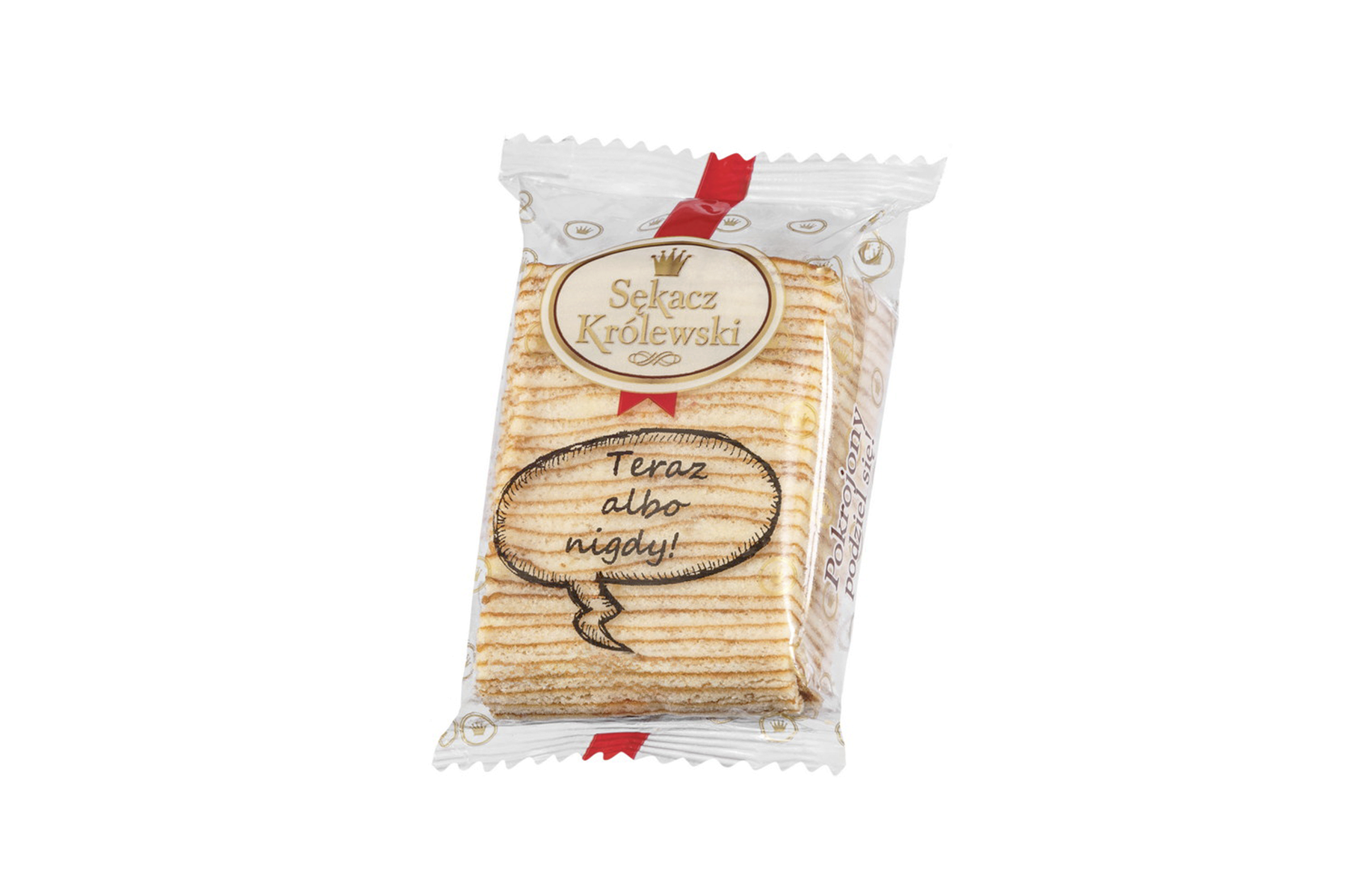 Königlicher Schichtkuchen 50 g von SECPOL ist in dekorativer Folie verpackt, durch die das Produkt und seine visuellen Eigenschaften gut sichtbar sind – insbesondere der charakteristische Querschnitt der Teigschichten, der an die Jahresringe eines Baumstamms erinnert. Zusätzlich befinden sich auf der Vorderseite der Verpackung verschiedene personalisierte, humorvolle und gelegentliche Aufdrucke (in Schwarz- und Grautönen), die das Produkt noch attraktiver und einzigartiger machen. Die Folienverpackung ist mit speziellen Aufreißkerben zum einfachen Öffnen ausgestattet und besteht aus recyclingfähigen Materialien.