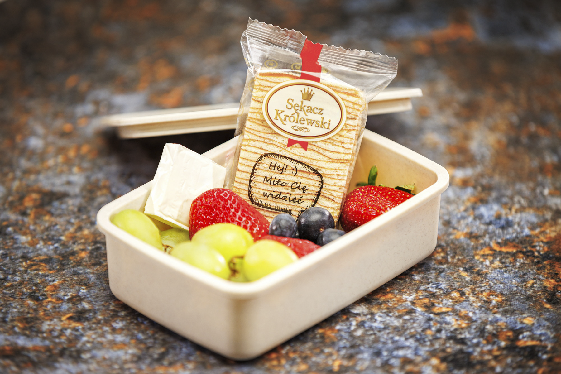 Königlicher Schichtkuchen 50 g von SECPOL ist in 3 dünne Stücke geschnitten und hat ein gesamtes Nettogewicht von 50 g, was eine ideale Portion für einen schnellen Snack darstellt, der den ersten Hunger stillt und einen passenden Energieschub liefert. Dadurch, dass Königlicher Schichtkuchen bereits geschnitten ist, lässt er sich leicht mit anderen teilen. Die einzigartige Form dieses Schichtkuchens ist rechtlich geschützt – seine Herstellung steht ausschließlich SECPOL zu, das über eingetragene Geschmacksmuster verfügt.