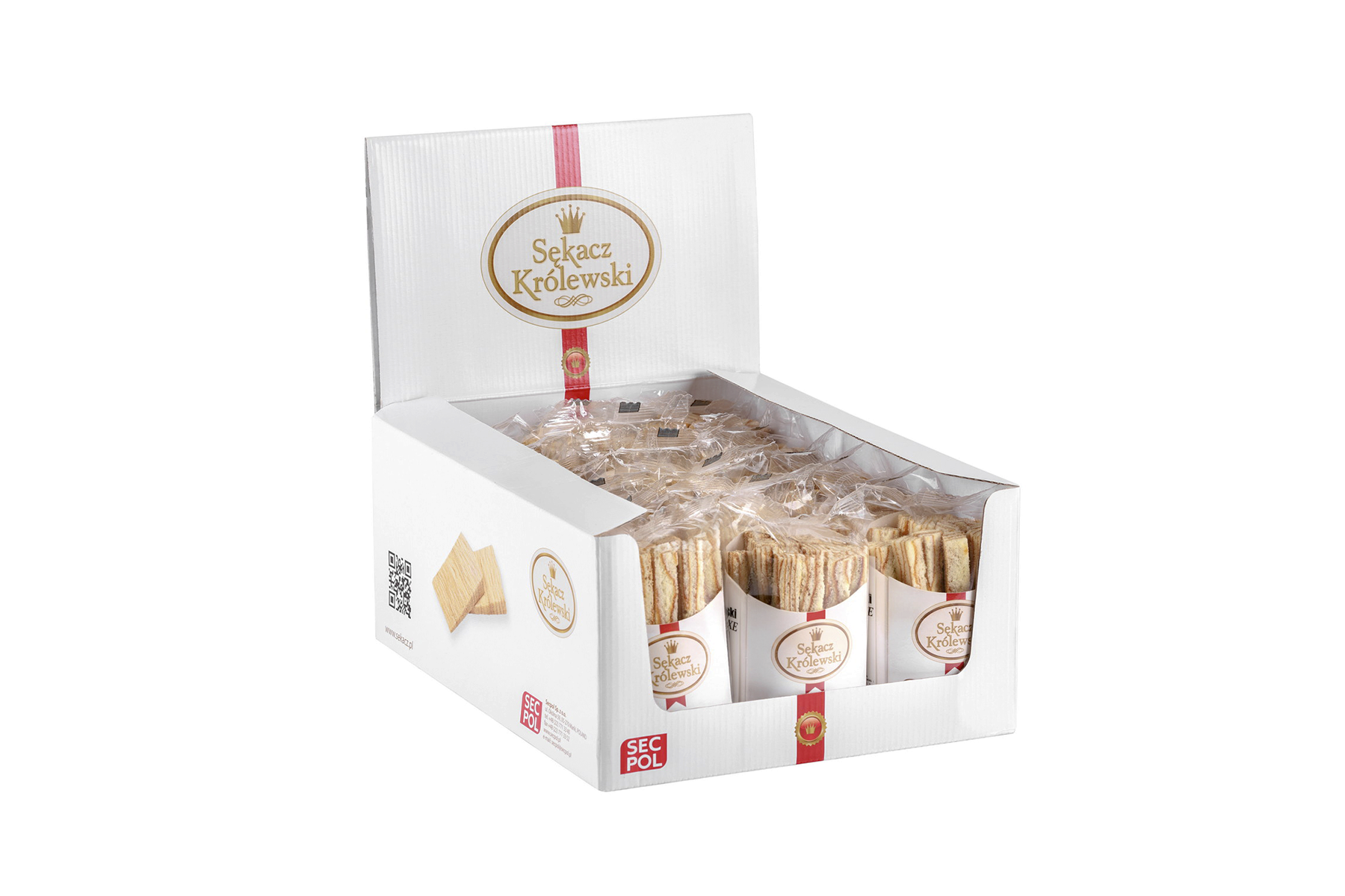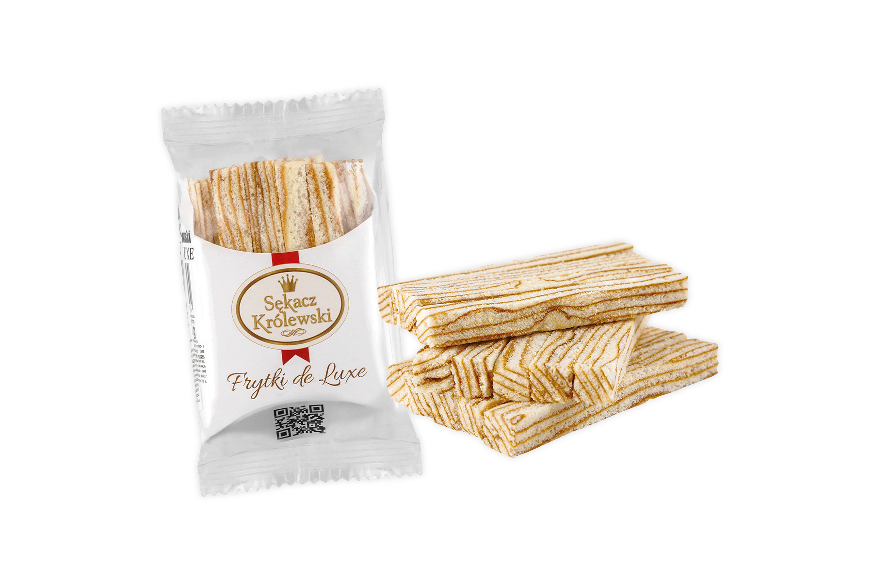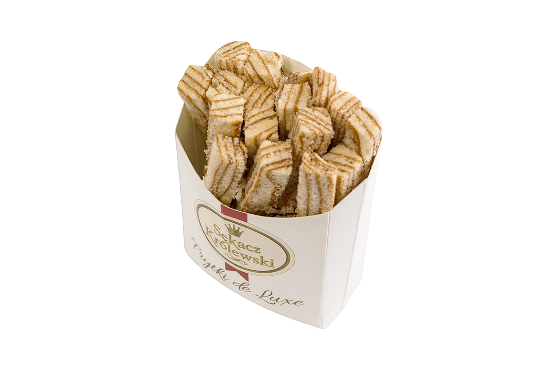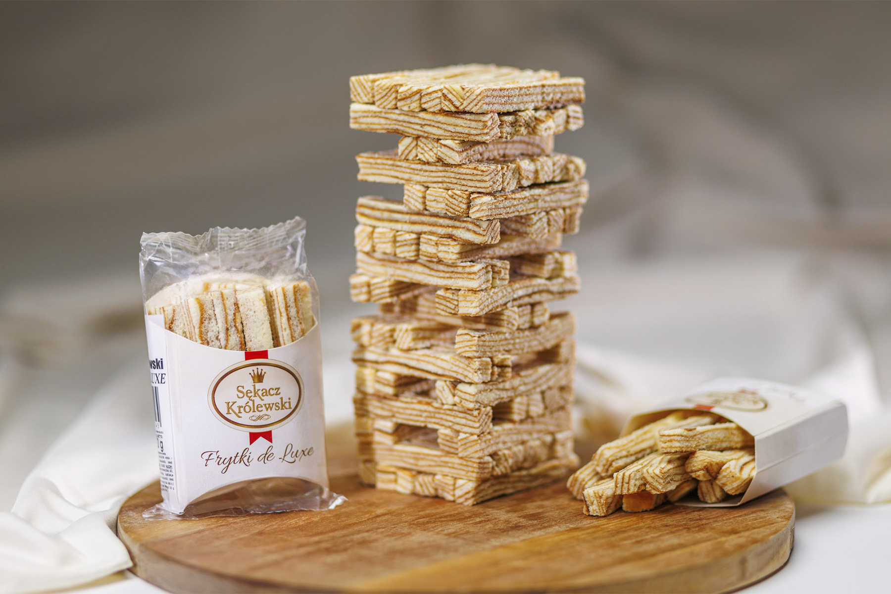 Royal Tree Cake – Fries de Luxe 70 g by SECPOL is tree cake cut into thin strips in the shape of French fries, with a total net weight of 70 g, making it an optimal portion for a quick snack that satisfies initial hunger and provides an energy boost. Thanks to being pre-cut, Royal Tree Cake can be easily shared with others. The unique form of this tree cake is legally protected – its production is exclusively reserved for SECPOL, which holds registered industrial designs.