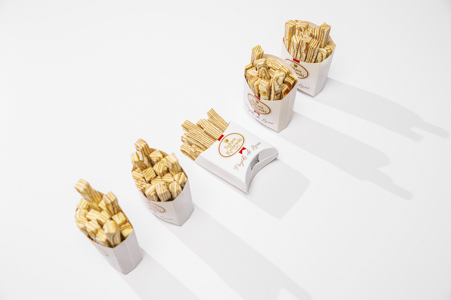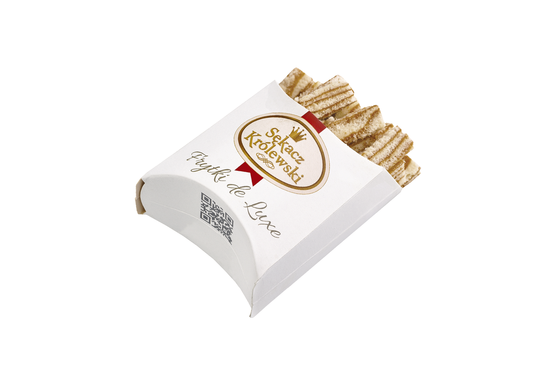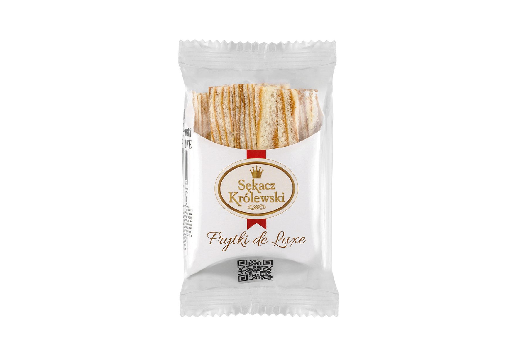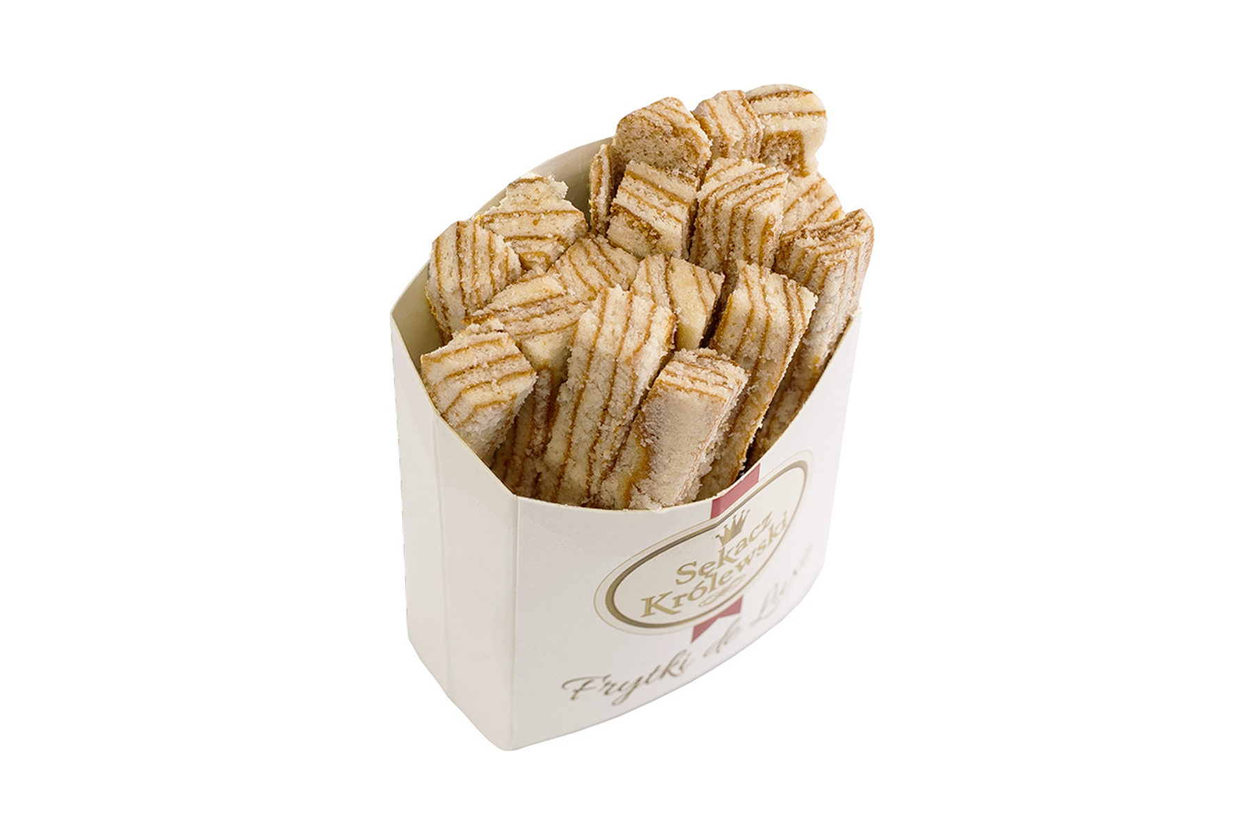 Royal Tree Cake – Fries de Luxe 70 g by SECPOL is tree cake cut into thin strips in the shape of French fries, with a total net weight of 70 g, making it an optimal portion for a quick snack that satisfies initial hunger and provides an energy boost. Thanks to being pre-cut, Royal Tree Cake can be easily shared with others. The unique form of this tree cake is legally protected – its production is exclusively reserved for SECPOL, which holds registered industrial designs.