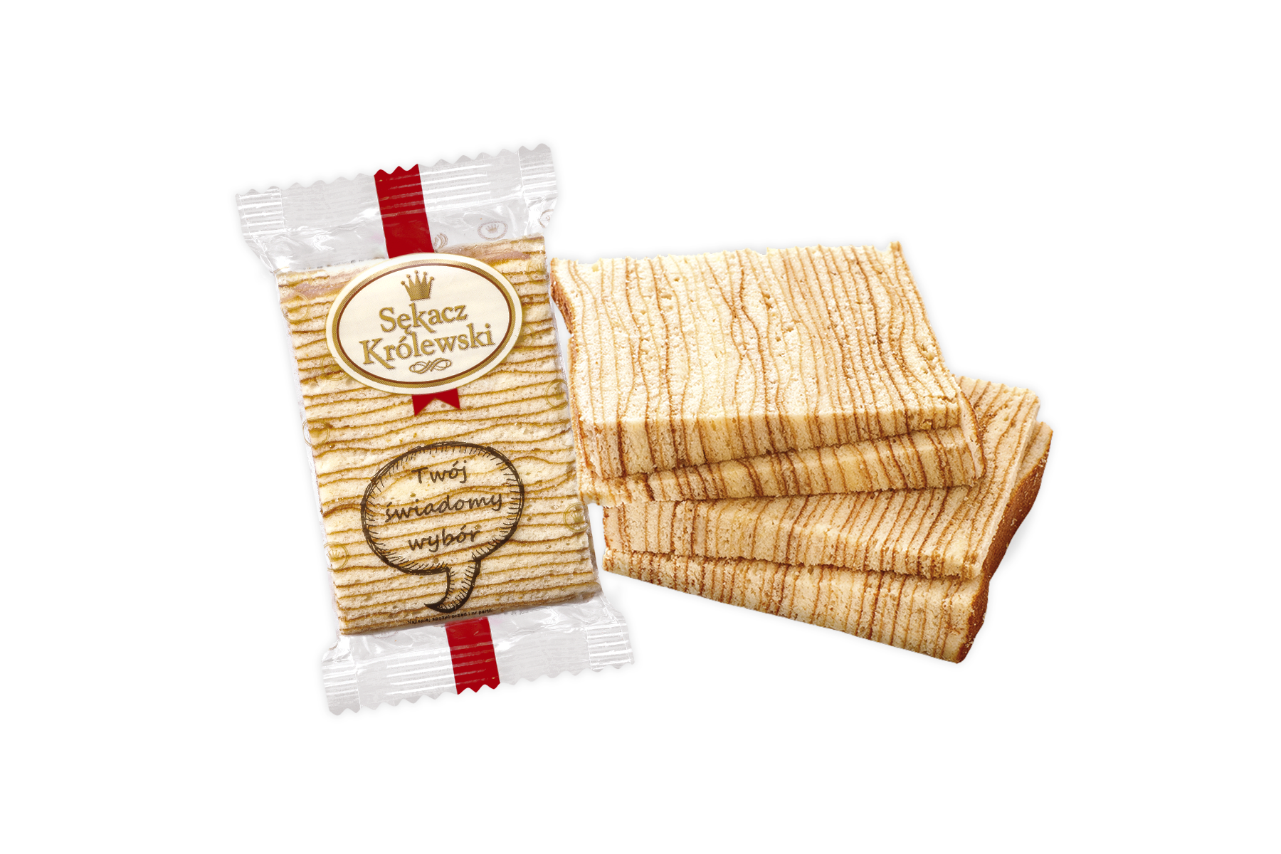 Sękacz Królewski firmy SECPOL to ciasto wytwarzane zgodnie z autorską recepturą oraz właściwą dla sękaczy metodą wypiekania – warstwa po warstwie – której efektem jest niepowtarzalny wzór przypominający przekrój pnia drzewa. Jego niezwykła forma jest wynikiem wielogodzinnej, żmudnej i perfekcyjnej obróbki cieplnej dokonywanej przez doświadczonych piekarzy.