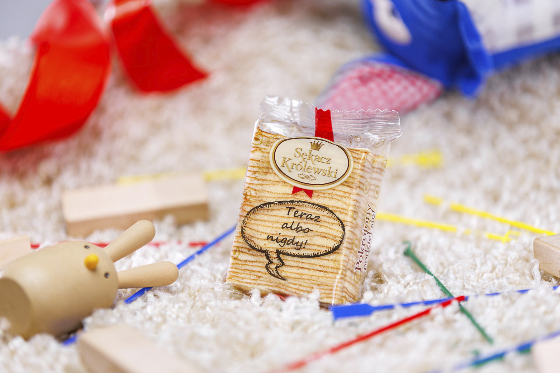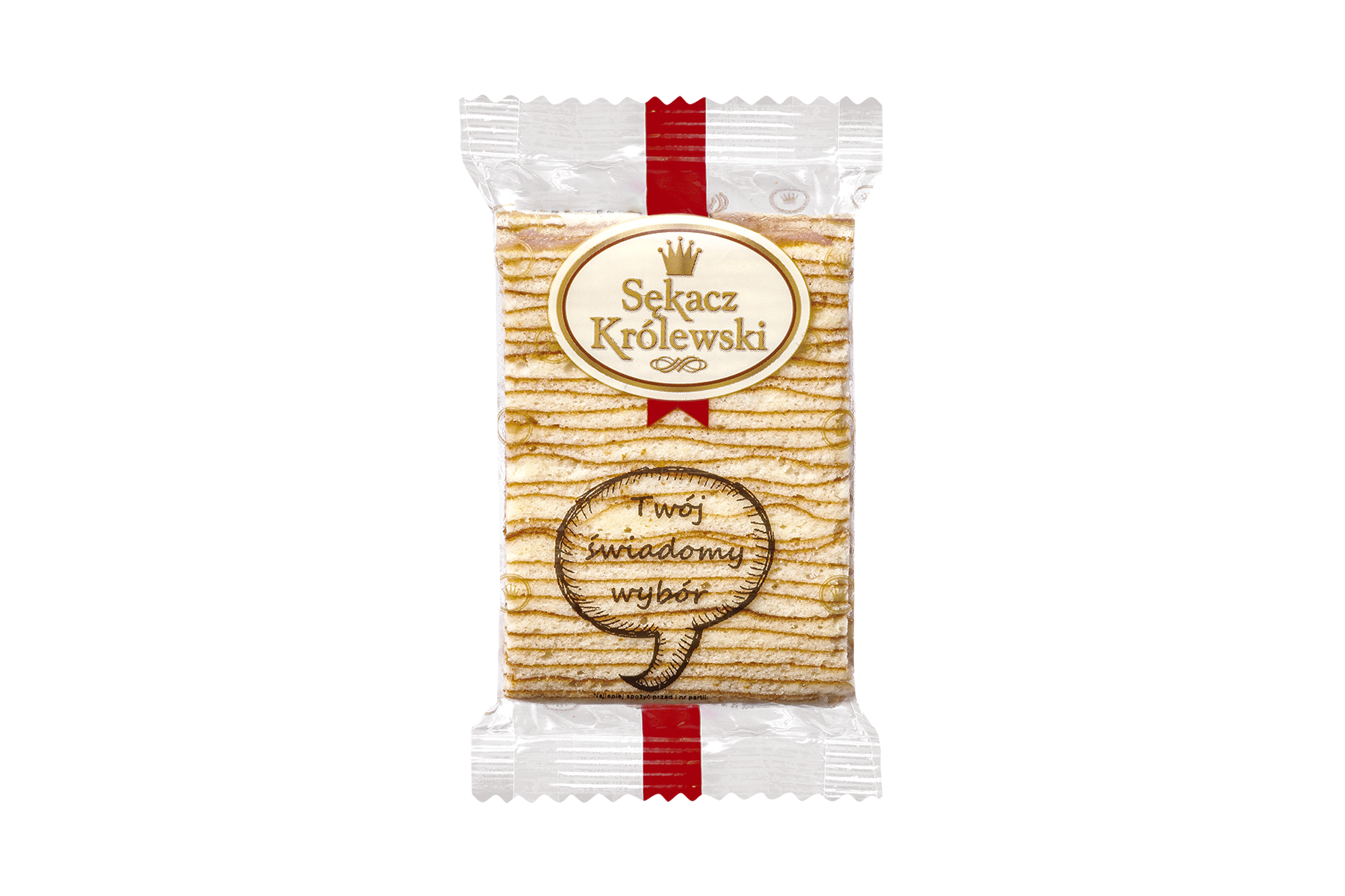 Sękacz Królewski 70 g firmy SECPOL jest zapakowany w ozdobną folię, przez którą dobrze widać produkt i jego walory wizualne, czyli charakterystyczny przekrój warstw ciasta przypominający słoje pnia drzewa. Dodatkowo na froncie opakowania umieszczane są różne spersonalizowane, humorystyczne i okazjonalne nadruki (w odcieniach czerni i szarości), które czynią produkt bardziej atrakcyjnym i niepowtarzalnym. Opakowanie foliowe wyposażono w specjalne nacięcia ułatwiające otwieranie i wykonano je z materiałów nadających się do recyklingu.