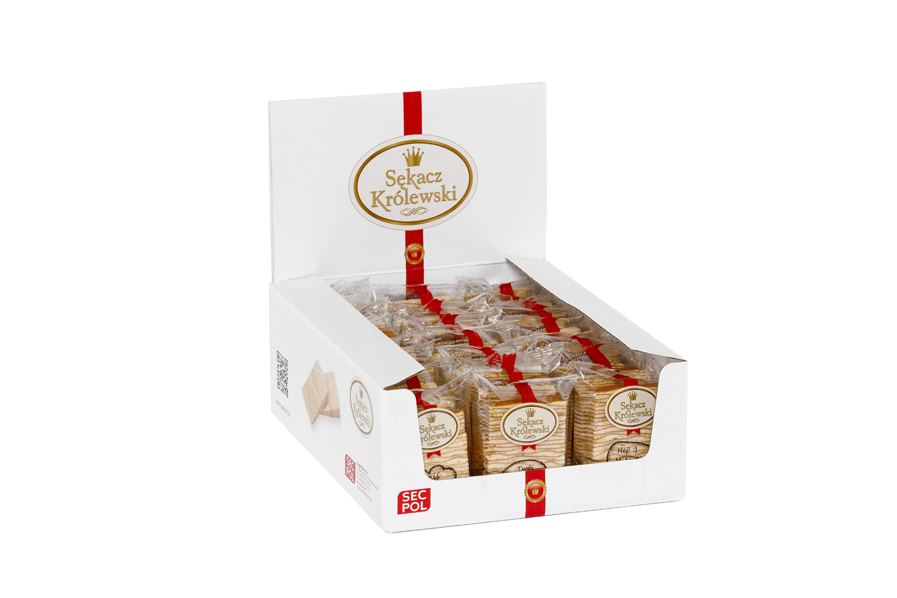Sękacz Królewski 70 g firmy SECPOL jest pokrojony w 4 cienkie kawałki o łącznej masie netto 70 g, co stanowi optymalną porcję na szybki posiłek, który zaspokoi pierwszy głód i da odpowiedni zastrzyk energii. Dzięki temu, że Sękacz Królewski jest pokrojony można się nim łatwo podzielić z innymi. Unikalna forma tego sękacza jest objęta ochroną prawną – jego produkcja przysługuje wyłącznie firmie SECPOL, która posiada zarejestrowane wzory przemysłowe.