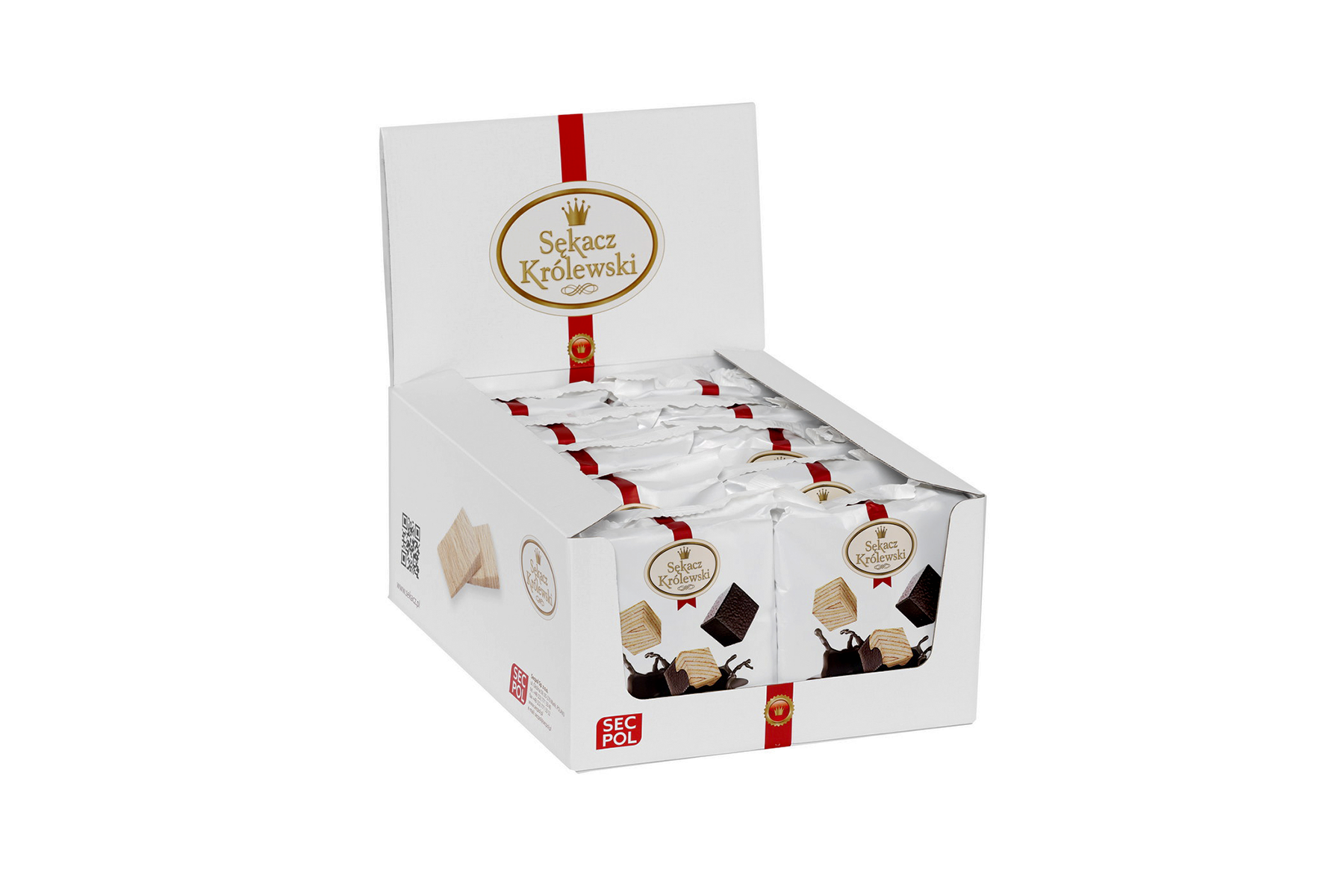 Sękacz Królewski – kostki w polewie 150 g firmy SECPOL jest umieszczony w praktycznej plastikowej tacce i opakowany w ozdobną folię z kolorowym nadrukiem oraz zdjęciem prezentującym produkt. Poręczna tacka z tworzywa umożliwia wygodne serwowanie sękacza w różnych miejscach i okolicznościach – nawet w podróży. Opakowanie foliowe wyposażono w specjalne nacięcia ułatwiające otwieranie i wykonano je z materiałów nadających się do recyklingu.