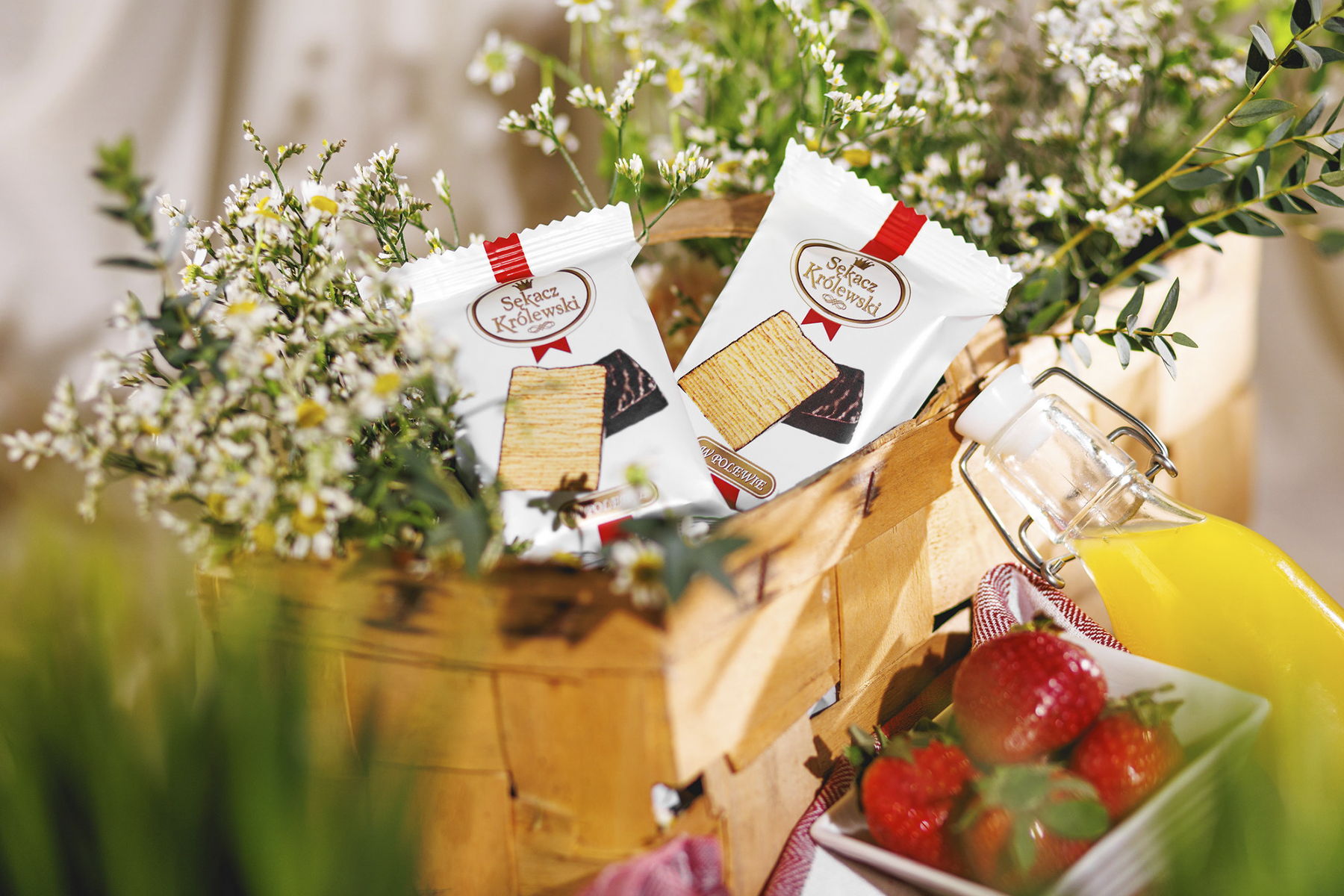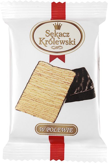 Sękacz Królewski w polewie 55 g firmy SECPOL jest zapakowany w ozdobną folię z kolorowym nadrukiem oraz zdjęciem prezentującym produkt. Poręczny i praktyczny – idealny jako słodki upominek do szkolnego plecaka czy na drogę. Opakowanie foliowe wyposażono w specjalne nacięcia ułatwiające otwieranie i wykonano je z materiałów nadających się do recyklingu.